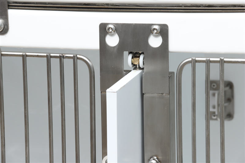 Muncung semburan dan hos pra-pasang, sistem saliran dengan penapis, dan soket kuasa mengubahnya daripada sangkar semata-mata menjadi stesen kerja pelbagai fungsi. Peralatan elektrik seperti mesin anestesia, penumpu oksigen, dan pad pemanas boleh dipasang pada soket dan digantung dari palang tengah pintu. Pintu hadapan Sangkar Anjing Modular Kaca Gentian Air Veterinar membenarkan pemasangan pelindung matahari melalui selekoh berbentuk U, menghalang cahaya matahari sambil berfungsi sebagai penghalang angin.